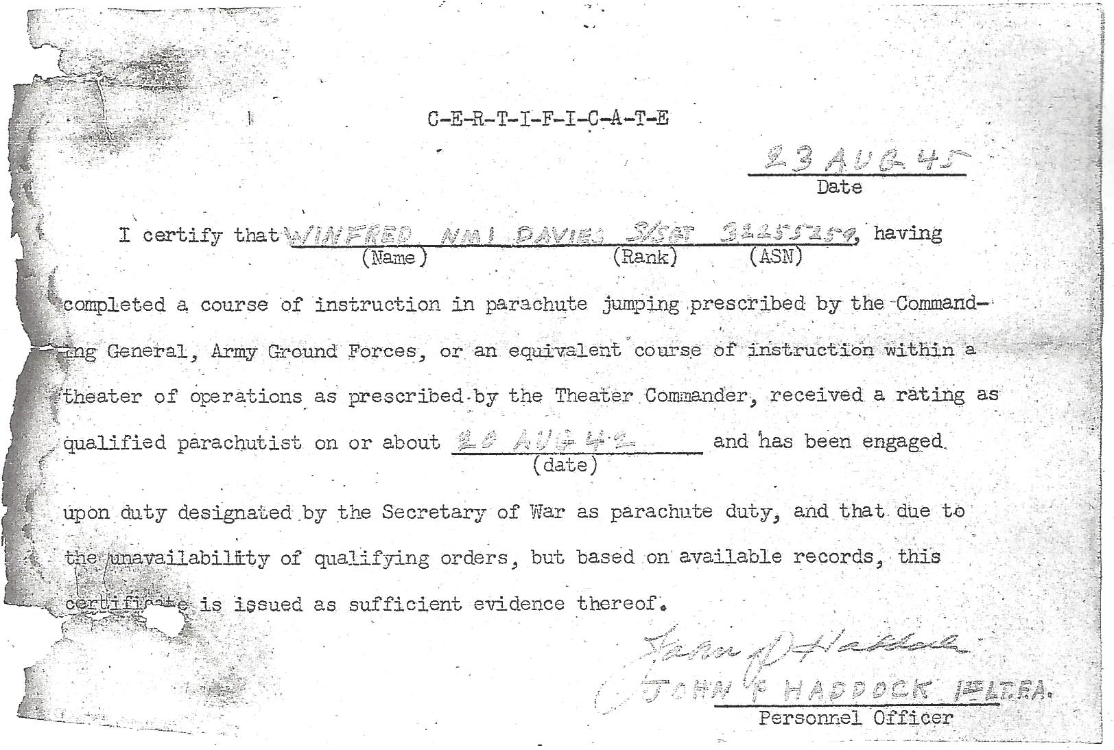 Staff Sergeant Winfred Davies was one of five brothers that served in WW-II. Winfred first served with the 505th Parachute Infantry Regiment, Company C as a medic in the Sicily and Italian campaigns. After Italy he was transferred into the 456th Parachute Field Artillery Battalion, as a medic with Headquarters Battery for the Normandy, Holland, Ardennes and Central Europe campaigns. Winfred earned the Silver Star medal in Italy with the 505 Parachute Infantry Regiment, the Purple Heart medal in Sicily with the 505, and an oak leaf cluster to the Purple Heart in Holland with the 456 Parachute Field Artillery Battalion. Staff Sergeant Davies made all four combat jumps.