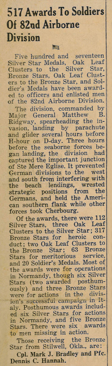 Hannah was selected to be part of a hand-picked platoon assigned to jump ahead of the division with a mission secure a key bridge near Camerian. This unit was segregated from the main company for special training and briefing on the assignment prior to the assault. Due to the isolation from the main body of troops, the platoon became known as the “Bastard Platoon”; a designation that would stick with Hannah’s 2nd Platoon of the E Company for the reminder of the war. This platoon was repeated called upon for special assignments and operations throughout the 750+ days of combat Hannah served with the 82nd during WWII. The platoon took off for Sicily on the night of July 9, 1943 as part of the first airborne invasion of WWII. The 505th PIR was pitted against the Hermann Goering panzer Division and was able to establish itself as a superb combat infantry unit. Sicily ended for the 82nd by the third week of July and by early September the division was making preparation for its second combat jump into Italy. Hannah’s unit parachuted into the Slerno Bay area to reinforce the Fifth Army which as having difficult time in the Salerno amphibious landing. With the seizure of Naples on October 1, 1943, the 82nd moved north to the Volturno River. Hard fighting, negotiation of difficult terrain and a case of malaria describes Hannah’s combat role in the Italian Invasion. By late fall the 82nd was withdrawn from the Volturno campaign and redeployed, first to Belfast, Ireland and later to Leicester, England in preparation for the Normandy Invasion. Dennis Hannah’s jump wings displayed two stars signifying his combat jumps when he parachuted in Normandy prior to the beach landings on June 6, 1944. As part of the 2nd Battalion, Hannah’s company was positioned to the north of Ste. Mere Eglise to protect the division’s airhead. He participated in fierce fighting to capture and hold the Merdert River Bridge and was with the combined operation with seaborne troops to capture the Montebourg Station. It was Dennis Hannah who led a squad level attack that seized and knocked out a German 88mm, three gun artillery battery firing on the Utah Beach-head. He would later be awarded the Bronze Star for Valor by his gallantry, heroism, and leadership in that engagement. On June 13th while fighting in the drive to the Quineville-Montebourg-Le Ham ridge, Hannah was wounded by shrapnel and evacuated from the battlefield to Utah Beach and returned to England. The shrapnel, lodged in his right arm bone was unable to be removed and was left in place. He was later awarded the Purple Heart for wounds received in the Normandy Invasion.****(During a medical procedure in 1997, an x-ray at the OU Medical Center revealed that the shrapnel was still embedded in his upper arm bone. When questioned by his doctor as to what the object was, Hannah simply replied “that is a souvenir I brought home from the war”.)