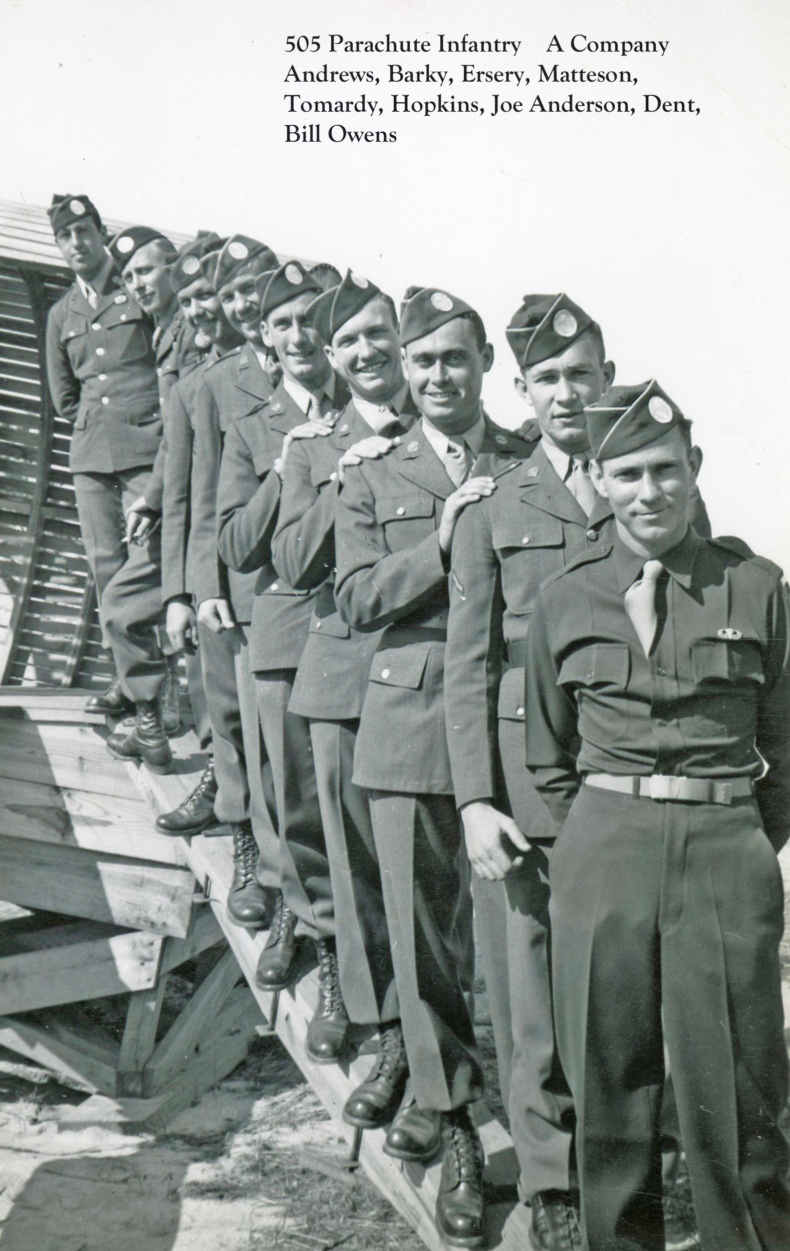 Born in Iowa, William Dale Owens enlisted into the Army on February 26th 1942 from Bellwood, Butler County, Nebraska. Bill served in A company making all four combat jumps during the war. On his third jump, D-Day, June 6th 1944, his company parachuted into a drop zone just west of the town of Saint Mere Eglise, France on the Normandy peninsula. Company A's objective that day was to take and hold, until relieved, the La Fiere bridge that spanned the Merderet River. This would prevent the German Army from reinforcing their positions on Utah beach. They were successful and accomplished their objective on D-Day taking the east side of the bridge. On D-Day + 1 the German's launched a counter attack with tanks, artillery and infantry. The paratroopers were shelled most of the day, He received his Combat Infantrymen Badge in Sicily. Staff Sergeant Owens was awarded the Purple Heart medal with oak leaf cluster and the Silver Star medal for his actions at the La Fiere causeway. (Many of his squad and platoon mates thought S/Sgt. Owens deserved the Distinguished Service Cross medal "at the least". Some thought he should have received the Medal of Honor.)