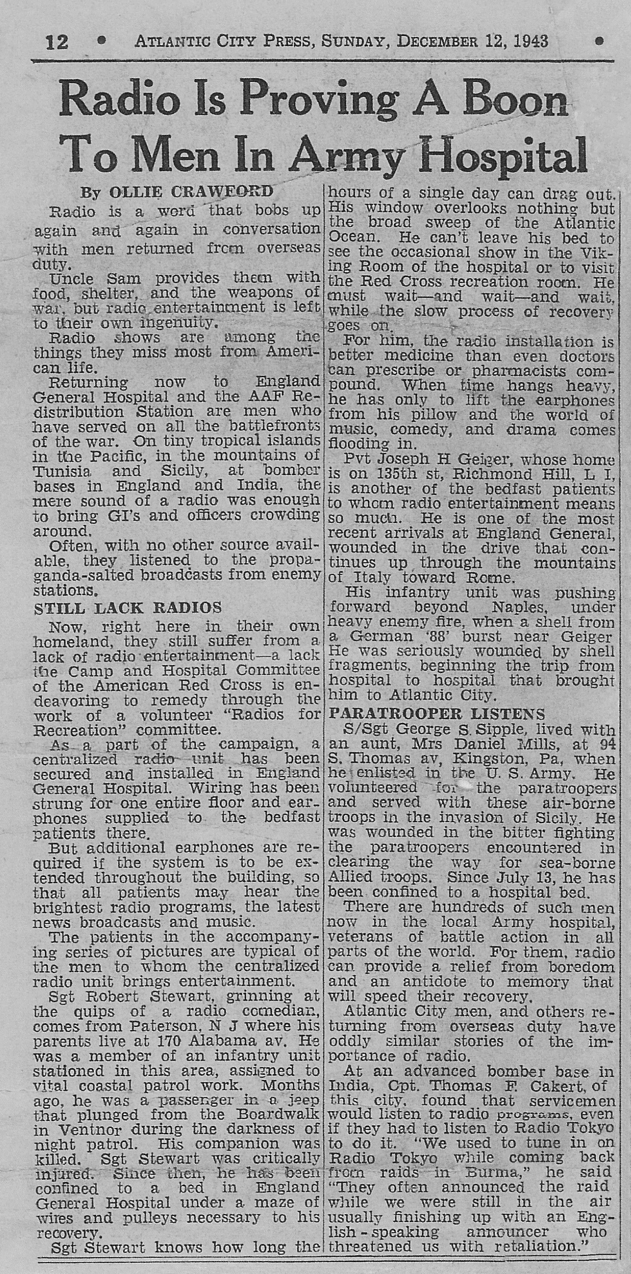George remained hospitalized overseas until September 6th 1943 when he sailed for the United States arriving September 22nd. He was admitted to the Thomas England General Hospital, Atlantic City, New Jersey. A news article in the Atlantic City Press December 12th 1943 (see clip below) features him and two other bedridden soldiers listening to radio broadcasts via the recently installed central radio system. George, like so many other soldiers, was confined to a hospital bed for several months and radio was a welcome source of entertainment.
